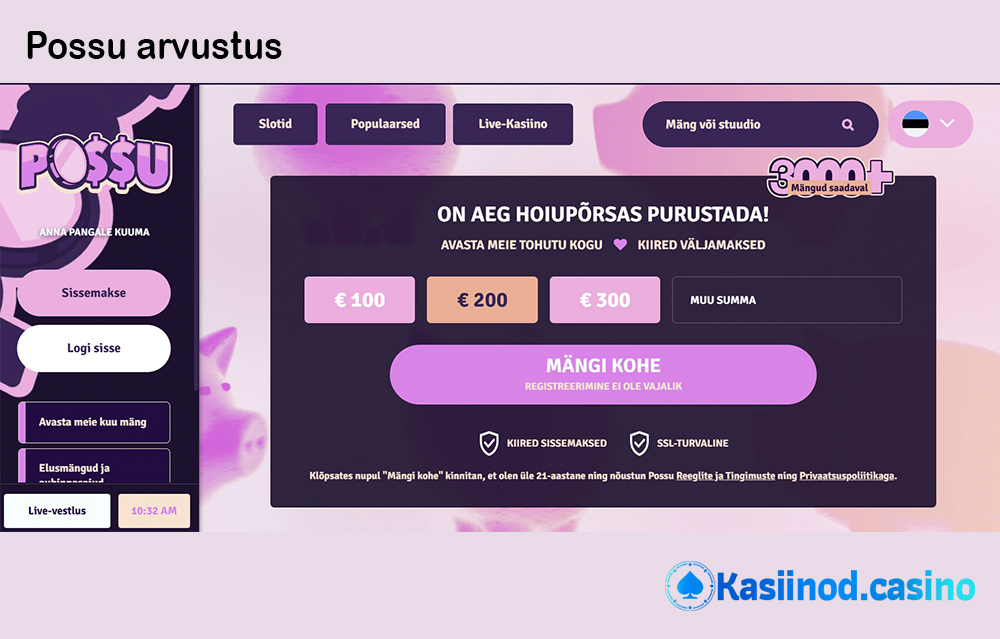 Jah, Possu tegutseb Eesti litsentsi alusel ning on reguleeritud. Lisaks kasutatakse turvalisi makselahendusi ja pakutakse vastutustundliku mängimise tööriistu.