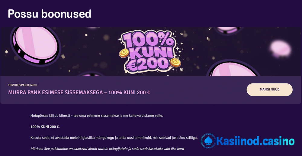 Possu kasiinol puudub tervitusboonus täielikult. See tähendab, et uue konto loomisel ei saa 100% sissemakseboonust ega tasuta spinne.