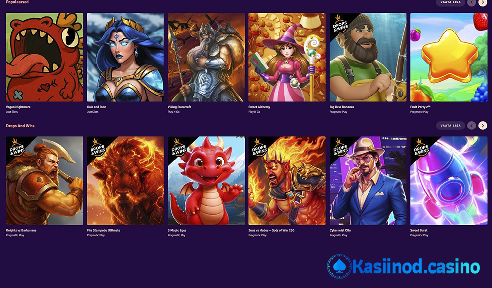 Mängutootjate nimekiri on pikk: Pragmatic Play, Red Tiger Gaming, Hacksaw Gaming, Play’n GO, Relax Gaming, Evolution, Thunderkick ja mitmed teised. See annab kindluse, et mängud on tuntud ja kvaliteetsed.