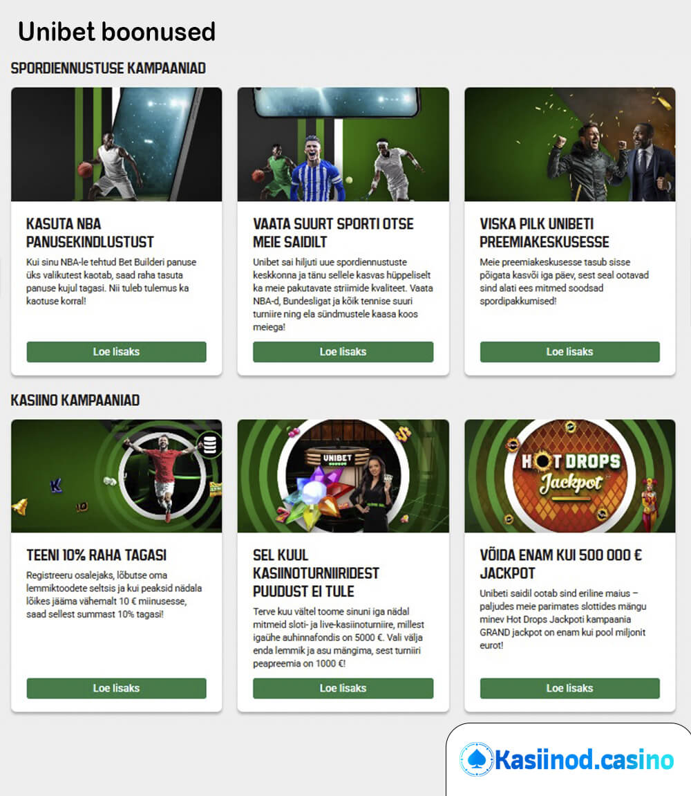 Oluline asi, mida kohe alguses mainida tuleb – Unibetis ei ole tervitusboonust. See eristab neid paljudest konkurentidest. Selle asemel keskendub Unibet iganädalasele cashbackile ja regulaarsetele kampaaniatele. Kui otsid hiiglaslikku 100% sissemakseboonust, siis siit sa seda ei leia. Kui otsid stabiilset, usaldusväärset ja pika kogemusega platvormi, siis oled õiges kohas.