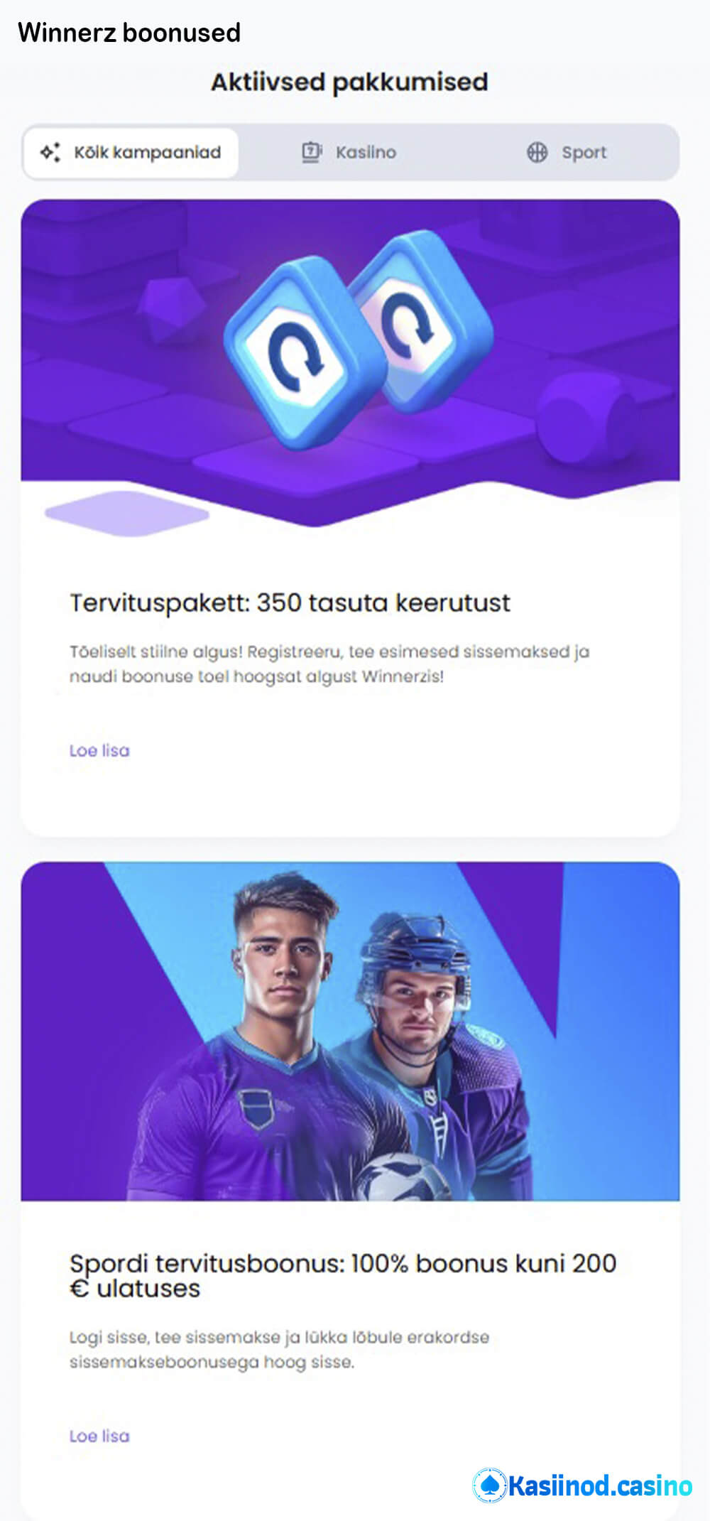 Winnerz pakub tervitusboonust nii kasiinole kui ka spordile panustajatele. Lisaks toimuvad regulaarsed kampaaniad, cashbackid ja turniirid, mis hoiavad keskkonna aktiivsena ka pärast esimest sissemakset.